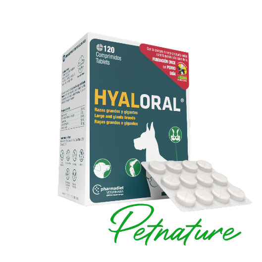 Hyaloral Razas Grandes y Gigantes 120 Comp es un complemento alimentario y condroprotector de perro a base de Ácido Hialurónico, Colágeno Hidrolizado enzimáticamente de alta pureza , Glucosamina Sulfato cristalizada, Condroitín Sulfato y gamma Orizanol que provocan beneficios relacionados con los cartílagos y las articulaciones así como la disminución del dolor para perros de raza grande o gigantes de al menos 20 kg de peso.