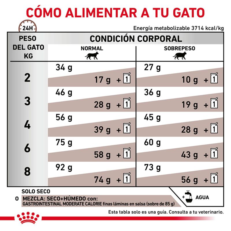 Royal Canin Veterinary Feline Gastrointestinal Moderate Calorie está especialmente formulado para satisfacer las necesidades de los gatos con sobrepeso o con tendencia al sobrepeso que tienen alterada la absorción de nutrientes y no digieren bien los alimentos. Gracias a su moderado contenido energético, este pienso dietético favorece el mantenimiento del peso ideal.